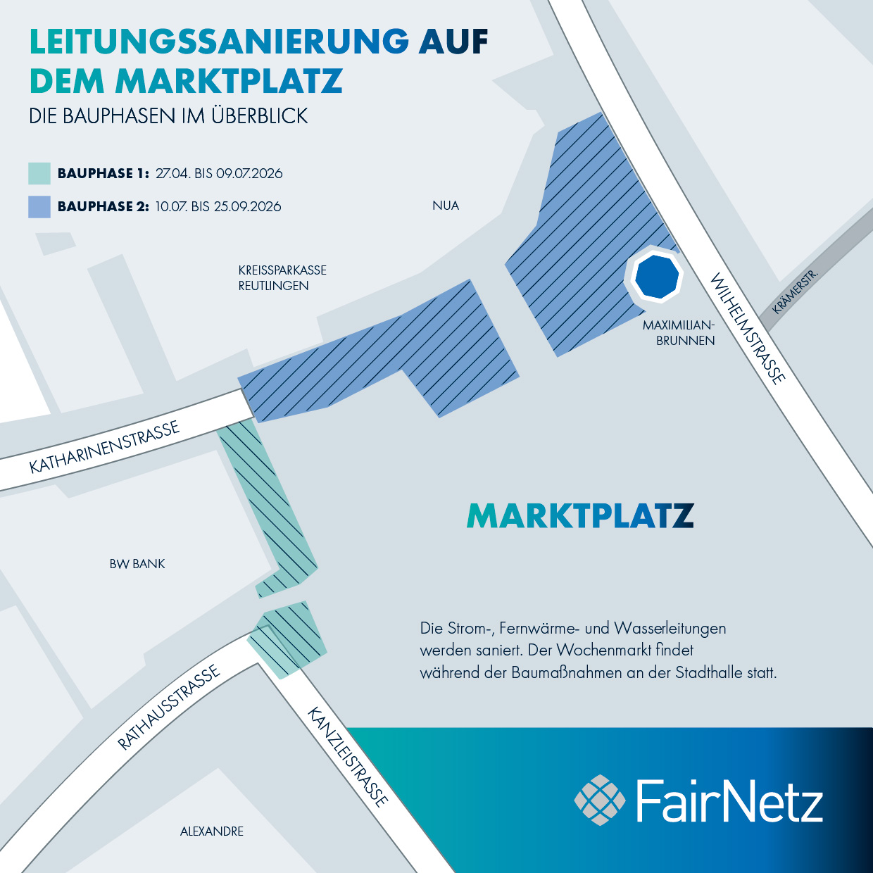 Auf dem Reutlinger Marktplatz werden die Strom- und Fernwärmeleitungen erneuert. Die Bauarbeiten sind notwendig, um die Versorgung langfristig und zuverlässig zu sichern. Wir erhalten so die Funktionsfähigkeit der Innenstadt und führen den Weg zu einer klimaneutralen Wärmeversorgung konsequent fort.